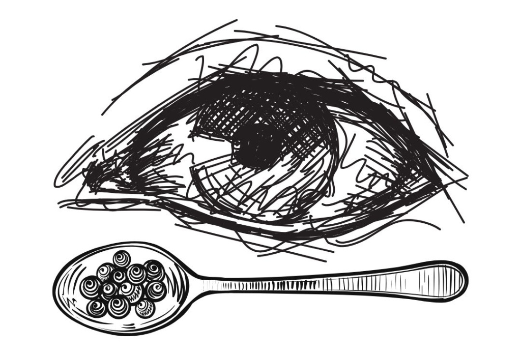 She stared at the arranged public official on her left, willing him to choke on his cravat, but with no other choice, her curiosity fleeting and her primal nerve asking her to once again run, she picked up the mother-of-pearl spoon, crafted so as to ensure no offending or alien taste would interfere with the precious cargo that sat upon it. An outsider might comment on the woman’s delicate demeanor and impeccable manners as she slowly and carefully, elegantly it would seem, reached into the tiny dish at her side and delicately scooped one opaque oblong piece, placing it on her demure tongue. An insider would feel or maybe hear the slight pop of the outer membrane as teeth bit down, and the gentle, sweet-salty ooze that laced the tongue and trickled down the throat.